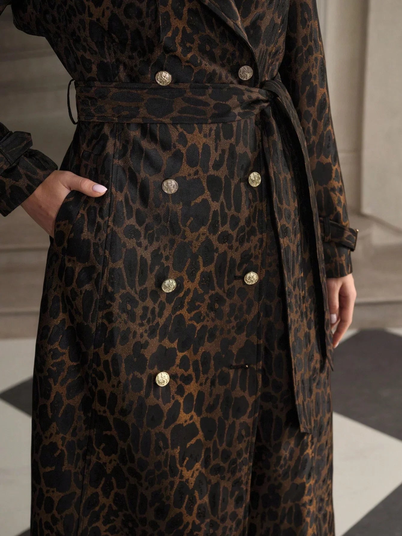 Timeless leopard print trench coat with a waist belt creates a refined silhouette. The double-breasted placket and collar add classic polish to a modern, relaxed fit. The all-over print delivers timeless elegance and quiet luxury, perfect for old money style applications in minimalist fashion. The body is unlined for easy layering, while the waist belt defines your shape with effortless sophistication.