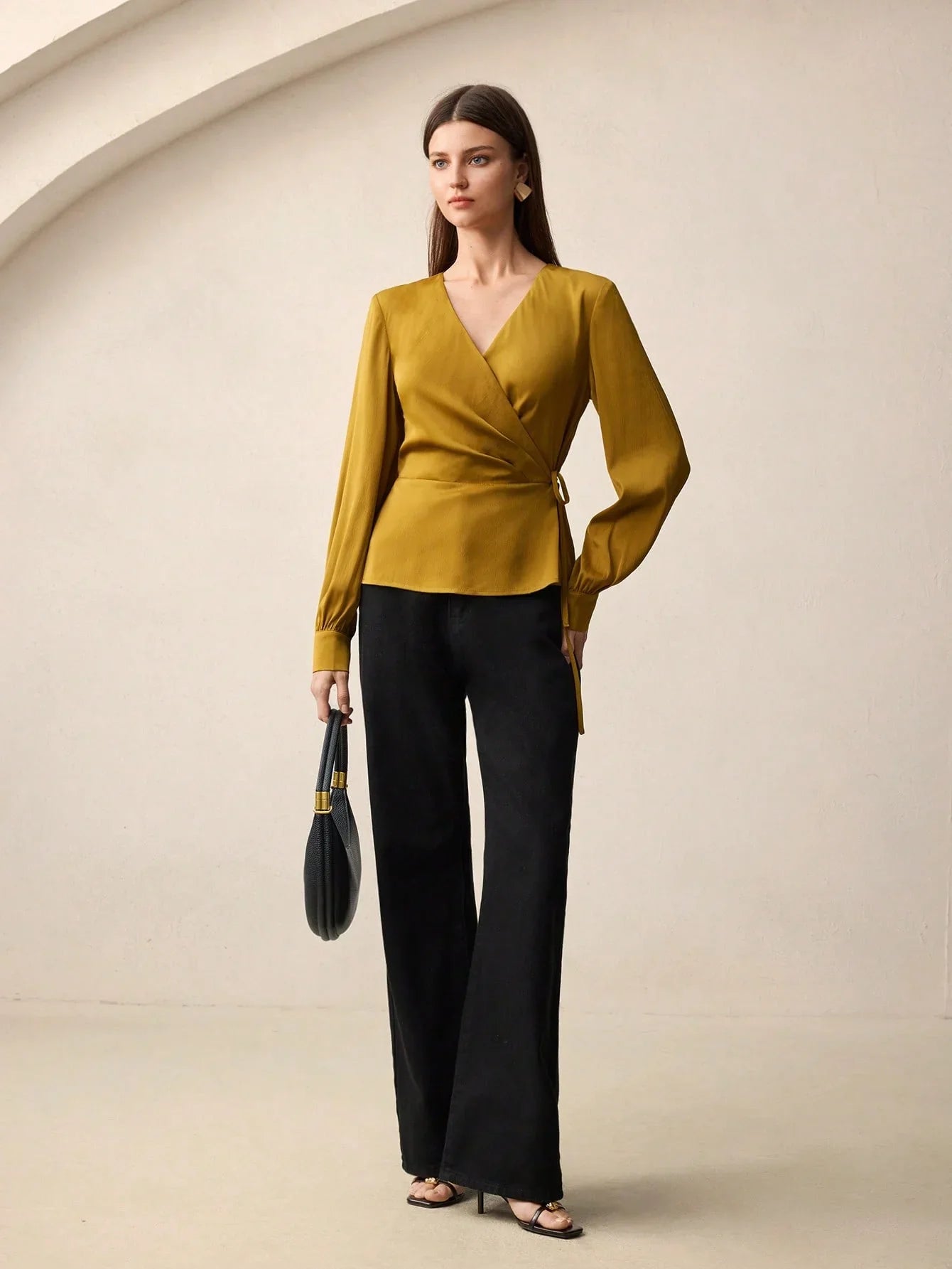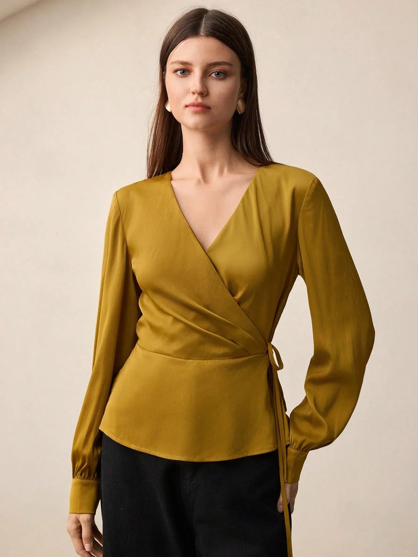Die Satinbluse strahlt zeitlose Eleganz Und ruhiger Luxus. Eine schicke Taille mit Bindeband formt einen sanften Schößchen, der die Figur schmeichelt, während der V-Ausschnitt eine raffinierte, feminine Linie verleiht. Lange Ärmel sorgen für eine klare, minimalistische Silhouette, geeignet für Stil des alten Geldes Und minimalistische Mode.